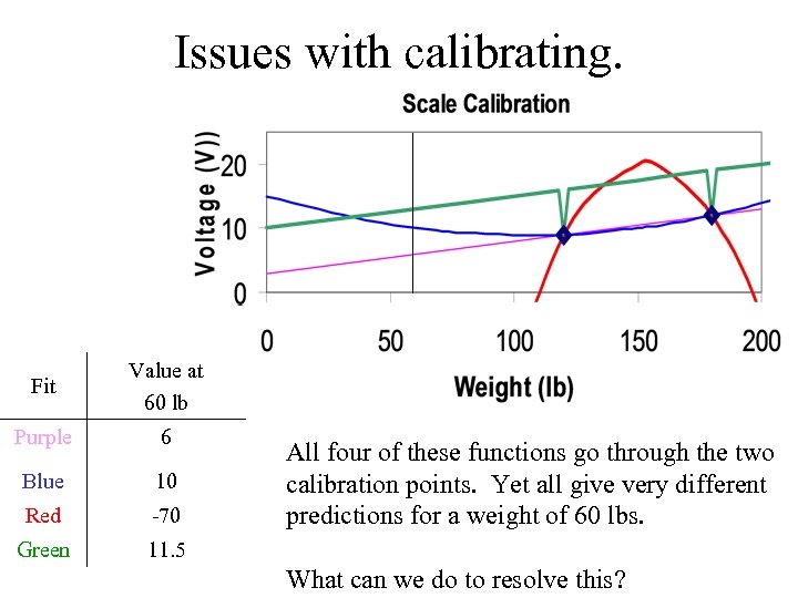 Issues with calibrating. Fit Value at 60 lb Purple 6 Blue 10 Red -70 Green 11. 5 All four of these functions go through the two calibration points. Yet all give very different predictions for a weight of 60 lbs. What can we do to resolve this?