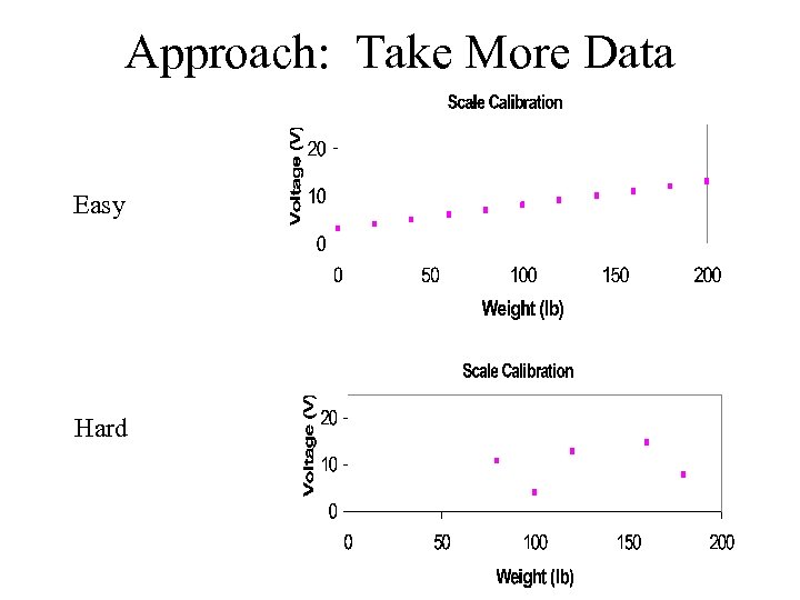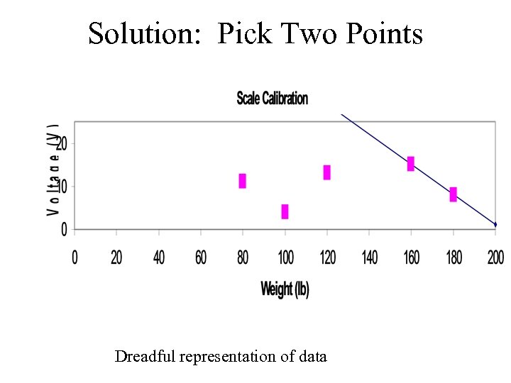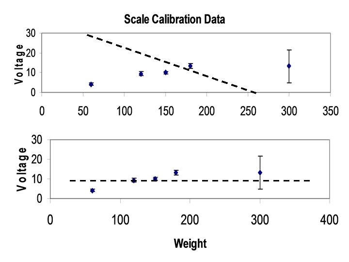 Calibrating the Scale 120 lb girl 180 lb guy = 9 V = 12 V (120, 9) (150, 12) Make a line, solve slope and intercept y=mx+b Voltage = (0. 05) weight + 3 Implies Weight = 20 (Voltage – 3) This implies that you can know the voltage for any weight. For instance, a weight of 60 lbs will give a voltage of 6 V. Now you have a calibrated scale. (Or do you? )