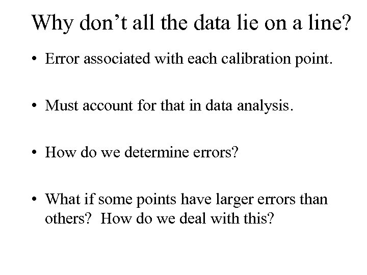 Why don’t all the data lie on a line? • Error associated with each calibration point. • Must account for that in data analysis. • How do we determine errors? • What if some points have larger errors than others? How do we deal with this?