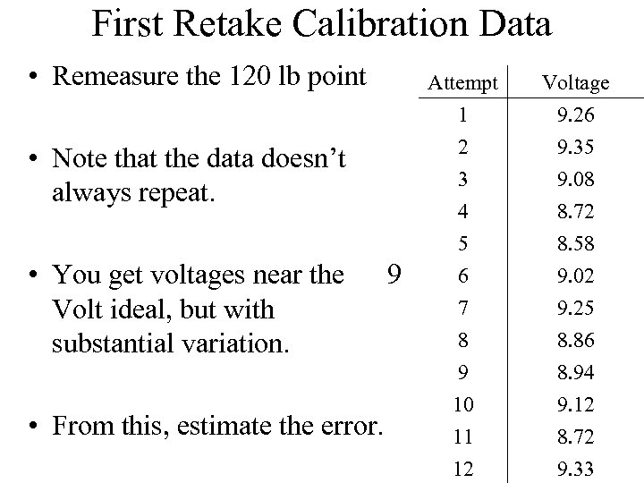 First Retake Calibration Data • Remeasure the 120 lb point Attempt 1 2 3 • Note that the data doesn’t always repeat. • You get voltages near the Volt ideal, but with substantial variation. • From this, estimate the error. 9 Voltage 9. 26 9. 35 9. 08 4 5 6 7 8 9 10 11 8. 72 8. 58 9. 02 9. 25 8. 86 8. 94 9. 12 8. 72 12 9. 33