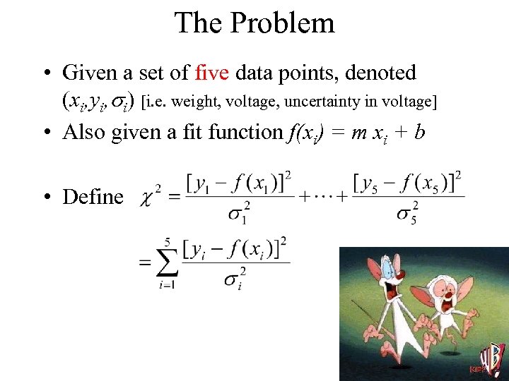 The Problem • Given a set of five data points, denoted (xi, yi, si) [i. e. weight, voltage, uncertainty in voltage] • Also given a fit function f(xi) = m xi + b • Define Looks Intimidating!