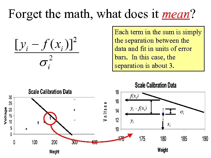 Forget the math, what does it mean? Each term in the sum is simply the separation between the data and fit in units of error bars. In this case, the separation is about 3. f(xi) yi - f(xi) yi si xi