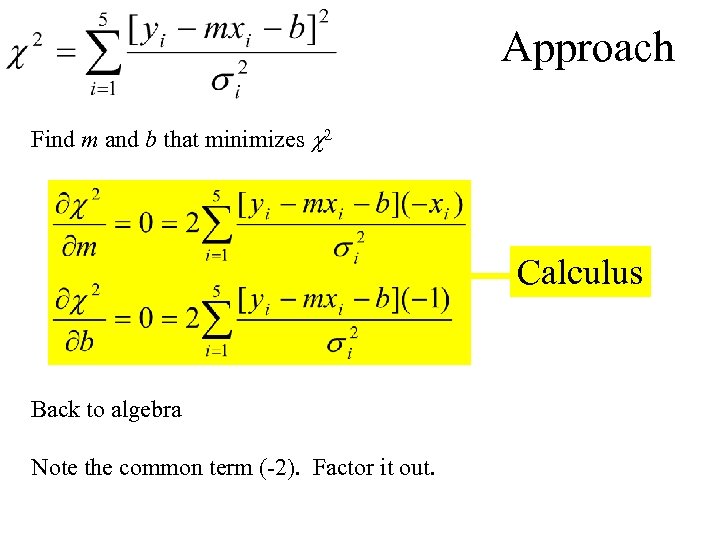 Approach Find m and b that minimizes c 2 Calculus Back to algebra Note the common term (-2). Factor it out.