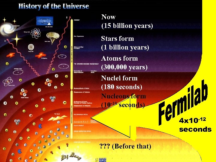 Now (15 billion years) Stars form (1 billion years) Atoms form (300, 000 years) Nuclei form (180 seconds) Nucleons form (10 -10 seconds) 4 x 10 -12 seconds ? ? ? (Before that)