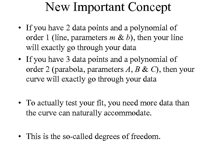 New Important Concept • If you have 2 data points and a polynomial of order 1 (line, parameters m & b), then your line will exactly go through your data • If you have 3 data points and a polynomial of order 2 (parabola, parameters A, B & C), then your curve will exactly go through your data • To actually test your fit, you need more data than the curve can naturally accommodate. • This is the so-called degrees of freedom.