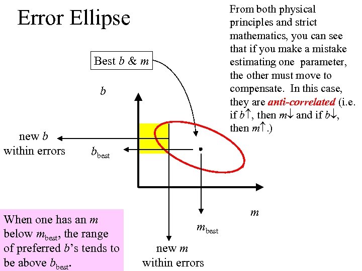 From both physical principles and strict mathematics, you can see that if you make a mistake estimating one parameter, the other must move to compensate. In this case, they are anti-correlated (i. e. if b , then m and if b , then m. ) Error Ellipse Best b & m b new b within errors bbest When one has an m below mbest, the range of preferred b’s tends to be above bbest. m mbest new m within errors