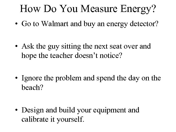 How Do You Measure Energy? • Go to Walmart and buy an energy detector? • Ask the guy sitting the next seat over and hope the teacher doesn’t notice? • Ignore the problem and spend the day on the beach? • Design and build your equipment and calibrate it yourself.