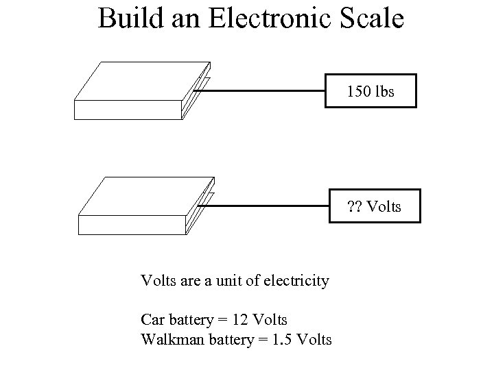 Build an Electronic Scale 150 lbs ? ? Volts are a unit of electricity Car battery = 12 Volts Walkman battery = 1. 5 Volts