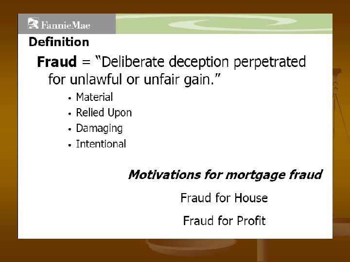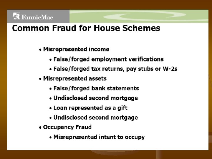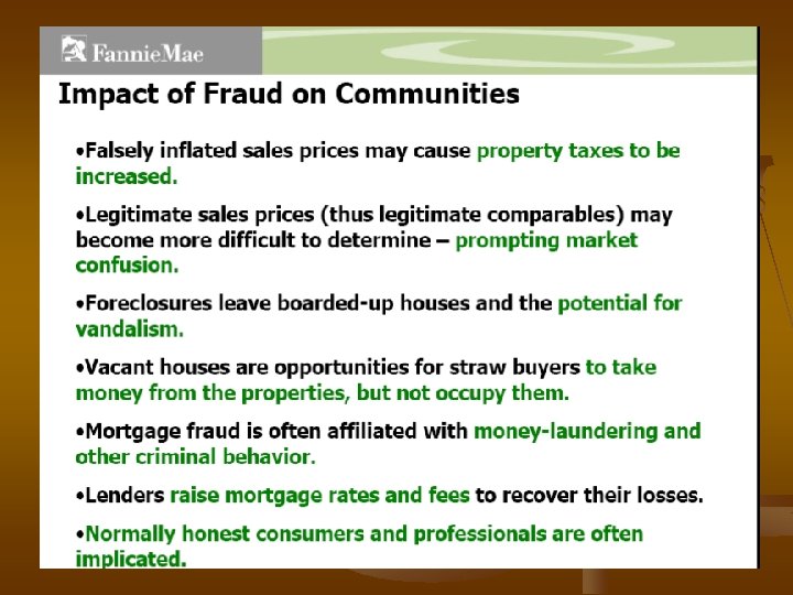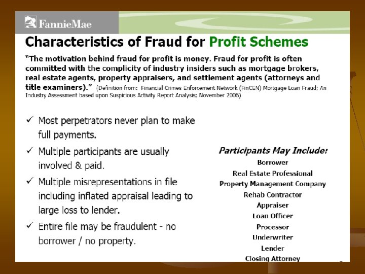 For-Profit Mortgage Fraud n Fake/Stolen Identity n n Inflated appraisals n n Stolen identities - along with credit histories - are used on a loan application. An appraiser agrees to inflate the property of the house. Equity skimming n n An investor uses a straw buyer to get a mortgage. Prior to closing, the straw buyer signs the property over to the investor, who in turn rents the property out without making any mortgage payments.
