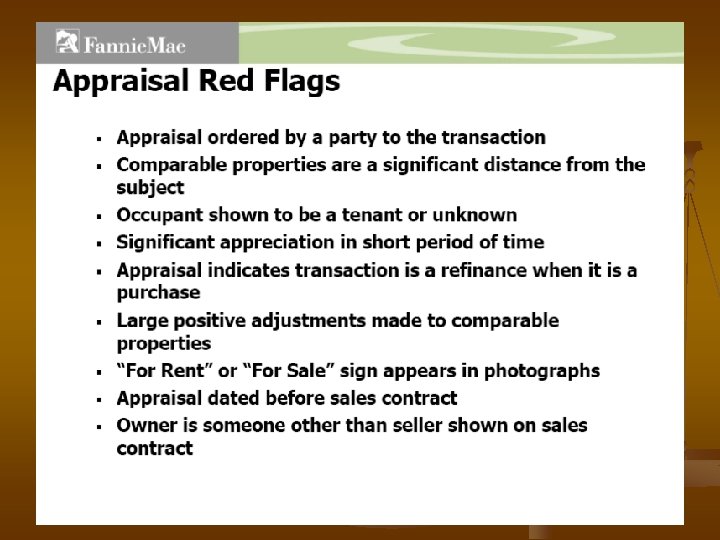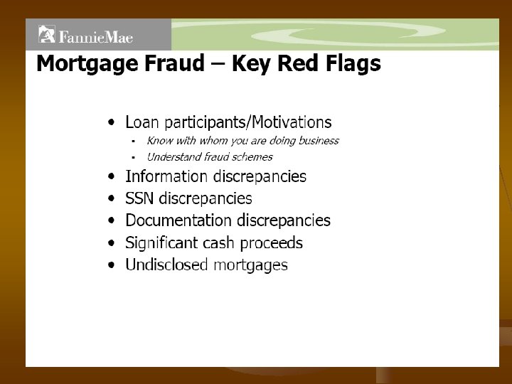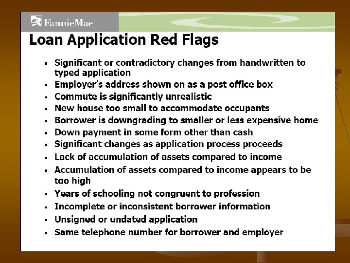 RED FLAGS n. A lender or investor tells the victim they are the only chance of getting a loan. n The victim is asked to sign a sales contract or loan documents that are blank or that contain information which is not true.