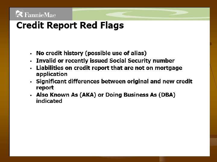 Consumer Tips n Shop and compare lenders and costs. n n www. bankrate. com Do not let anyone persuade them to make a false statement on their application, such as: n Overstating their income n The source of their down payment n Failing to disclose the nature and amount of their debts n Length of their employment