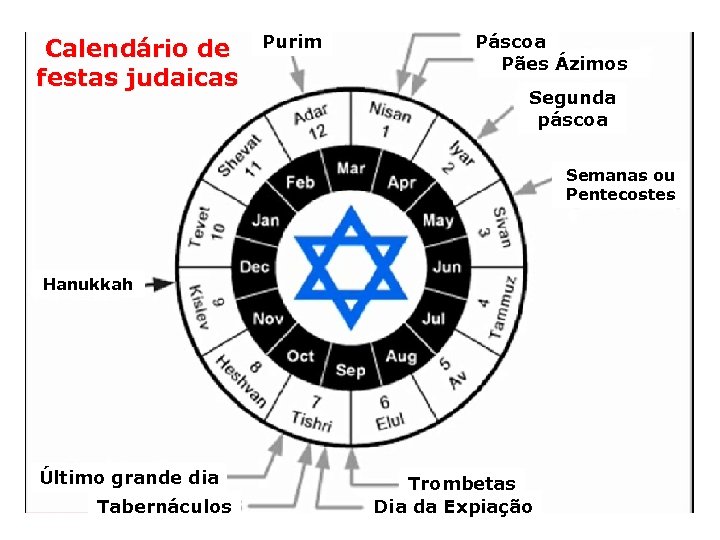 Calendário de festas judaicas Purim Páscoa Pães Ázimos Segunda páscoa Semanas ou Pentecostes Hanukkah Último grande dia Tabernáculos Trombetas Dia da Expiação