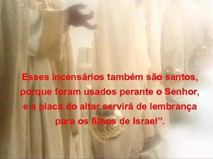 Esses incensários também são santos, porque foram usados perante o Senhor, e a placa do altar servirá de lembrança para os filhos de Israel”.
