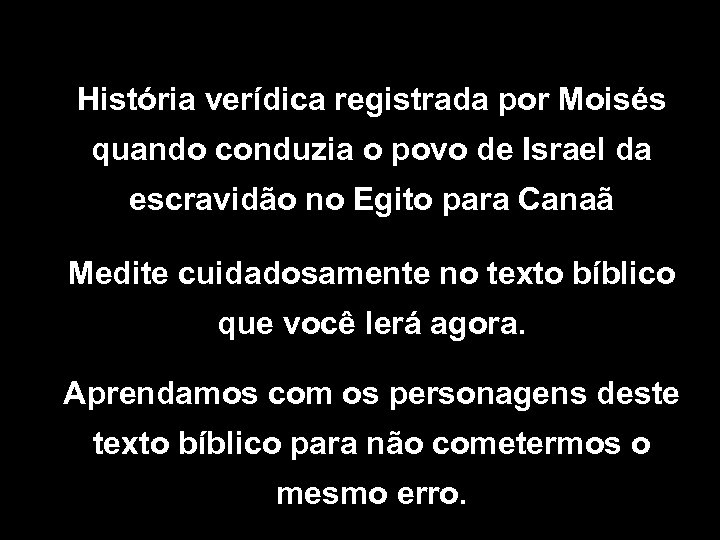 História verídica registrada por Moisés quando conduzia o povo de Israel da escravidão no Egito para Canaã Medite cuidadosamente no texto bíblico que você lerá agora. Aprendamos com os personagens deste texto bíblico para não cometermos o mesmo erro.
