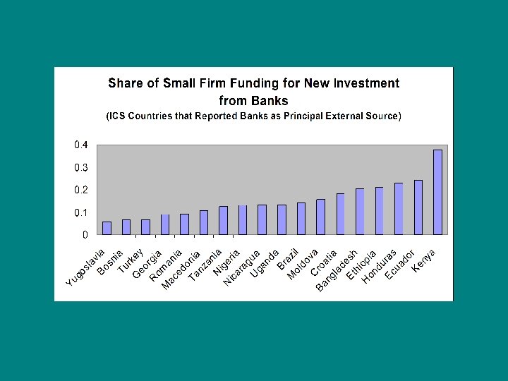 Beyond the core • The number of financial institutions seems to be an order of magnitude smaller – To be sure, less wealth => less finance – To some extent more inequality => less finance (because the rich make rather than buy financial services) • Government bears much of the blame in some places • This is particularly hard on SMEs