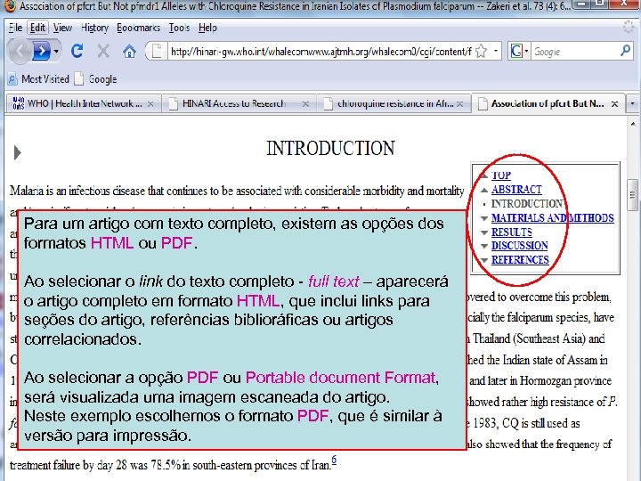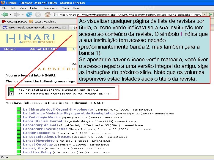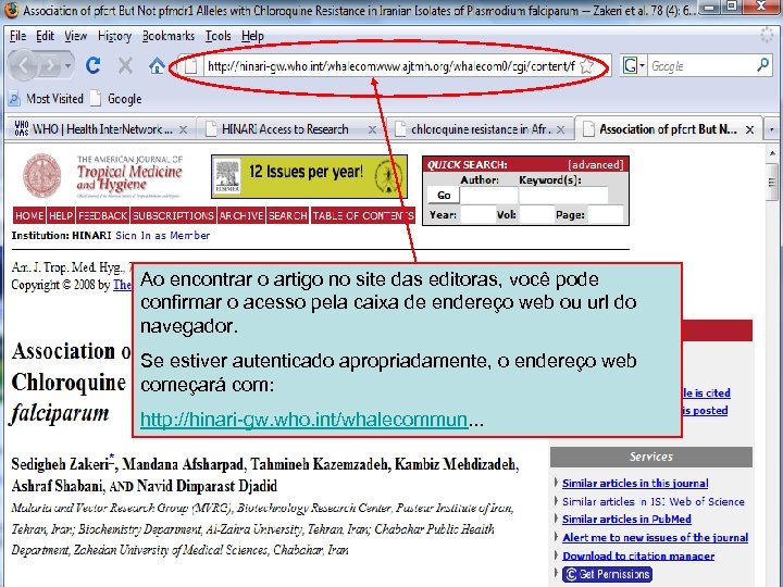 Linking to full text 5 Ao encontrar o artigo no site das editoras, você pode confirmar o acesso pela caixa de endereço web ou url do navegador. Se estiver autenticado apropriadamente, o endereço web começará com: http: //hinari-gw. who. int/whalecommun. . .