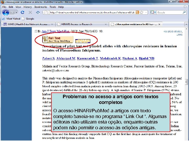 Linking to full text 4 Problemas no acesso a artigos com textos completos O acesso HINARI/Pub. Med a artigos com texto completo baseia-se no programa ' Link Out '. Algumas editoras não utilizam esta opção, enquanto outras podem não permitir o acesso às edições antigas.