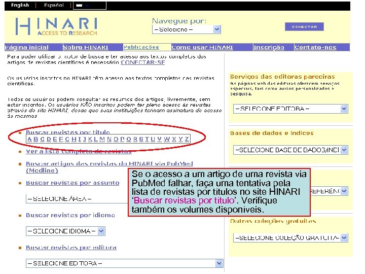Se o acesso a um artigo de uma revista via Pub. Med falhar, faça uma tentativa pela lista de revistas por títulos no site HINARI ‘Buscar revistas por título’. Verifique também os volumes disponíveis.