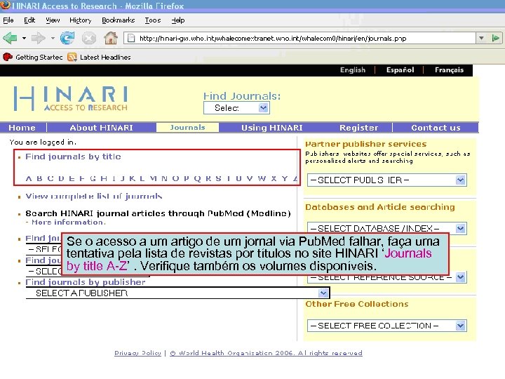 Accessing journals by title 1 Se o acesso a um artigo de um jornal via Pub. Med falhar, faça uma tentativa pela lista de revistas por títulos no site HINARI ‘Journals by title A-Z’. Verifique também os volumes disponíveis.
