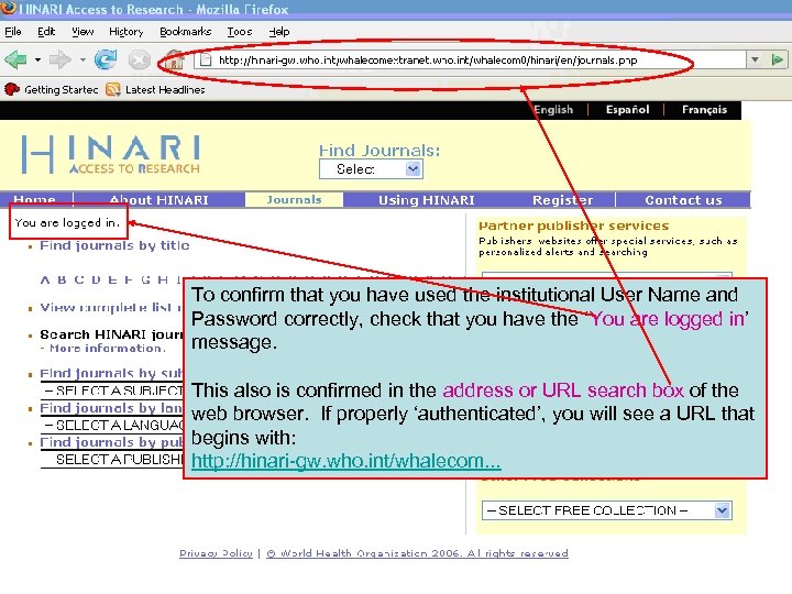 To confirm that you have used the institutional User Name and Password correctly, check that you have the ‘You are logged in’ message. This also is confirmed in the address or URL search box of the web browser. If properly ‘authenticated’, you will see a URL that begins with: http: //hinari-gw. who. int/whalecom. . .