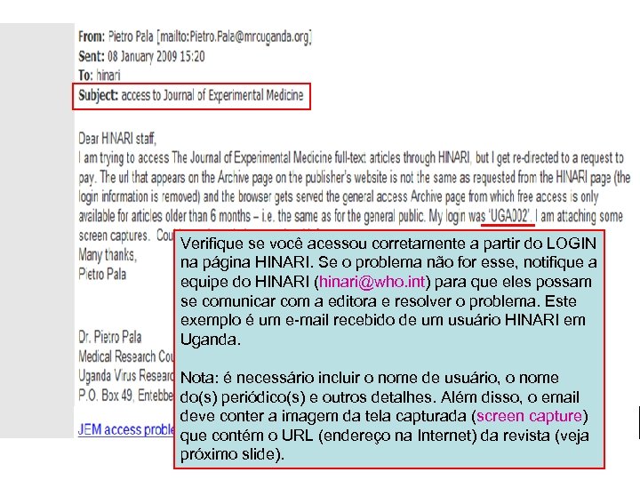 Verifique se você acessou corretamente a partir do LOGIN na página HINARI. Se o problema não for esse, notifique a equipe do HINARI (hinari@who. int) para que eles possam se comunicar com a editora e resolver o problema. Este exemplo é um e-mail recebido de um usuário HINARI em Uganda. Nota: é necessário incluir o nome de usuário, o nome do(s) periódico(s) e outros detalhes. Além disso, o email deve conter a imagem da tela capturada (screen capture) que contém o URL (endereço na Internet) da revista (veja próximo slide).