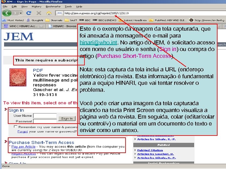 Este é o exemplo da imagem da tela capturada, que foi anexada à mensagem de e-mail para hinari@who. int. No artigo do JEM, é solicitado acesso com nome de usuário e senha (Sign in) ou compra do artigo (Purchase Short-Term Access). Nota: esta captura da tela inclui a URL (endereço eletrônico) da revista. Esta informação é fundamental para a equipe HINARI, que vai tentar resolver o problema. Você pode criar uma imagem da tela capturada clicando na tecla Print Screen enquanto visualiza a página web da revista. Em seguida, colar (editar/colar ou control/v) o material em um documento de texto e enviar como um anexo.