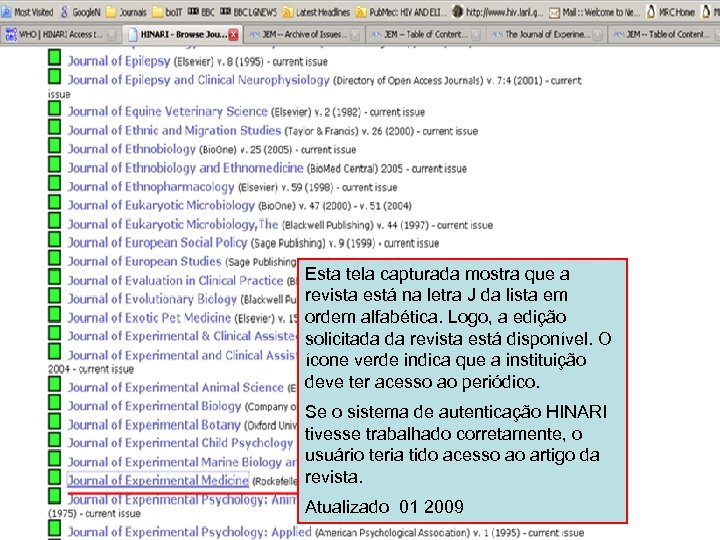 Esta tela capturada mostra que a revista está na letra J da lista em ordem alfabética. Logo, a edição solicitada da revista está disponível. O ícone verde indica que a instituição deve ter acesso ao periódico. Se o sistema de autenticação HINARI tivesse trabalhado corretamente, o usuário teria tido acesso ao artigo da revista. Atualizado 01 2009