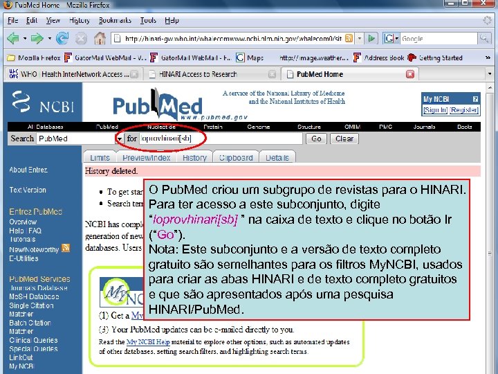 HINARI Subset 1 O Pub. Med criou um subgrupo de revistas para o HINARI. Para ter acesso a este subconjunto, digite “loprovhinari[sb] ” na caixa de texto e clique no botão Ir (“Go”). Nota: Este subconjunto e a versão de texto completo gratuito são semelhantes para os filtros My. NCBI, usados para criar as abas HINARI e de texto completo gratuitos e que são apresentados após uma pesquisa HINARI/Pub. Med.