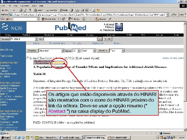 HINARI Subset 3 Os artigos que estão disponíveis através do HINARI são mostrados com o ícone do HINARI próximo do link da editora. Deve-se usar a opção resumo (" Abstract ") na caixa display do Pub. Med.