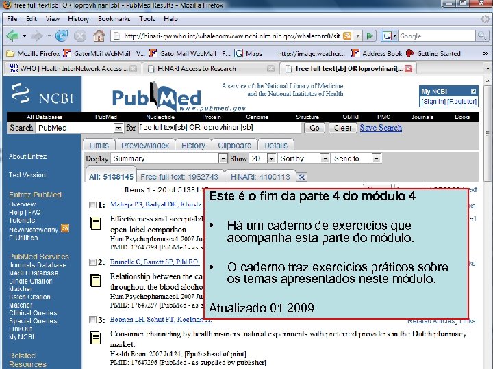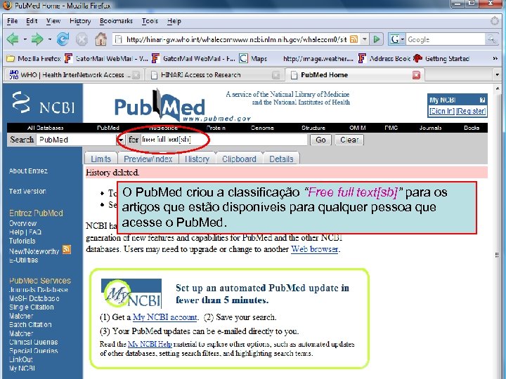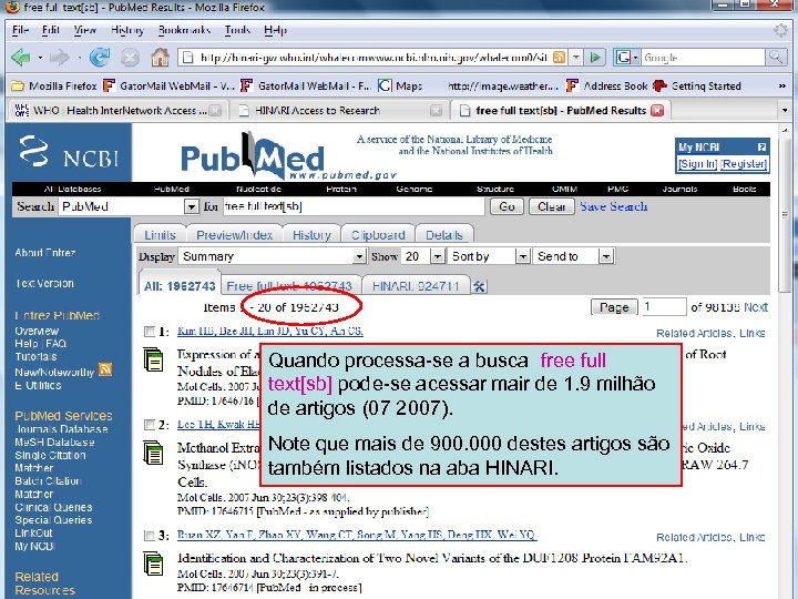 Free full text Subset 2 Quando processa-se a busca free full text[sb] pode-se acessar mair de 1. 9 milhão de artigos (07 2007). Note que mais de 900. 000 destes artigos são também listados na aba HINARI.