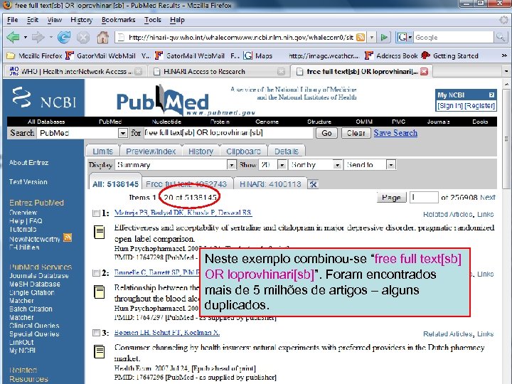 Loprovhinari and fft combined Neste exemplo combinou-se “free full text[sb] OR loprovhinari[sb]”. Foram encontrados mais de 5 milhões de artigos – alguns duplicados.
