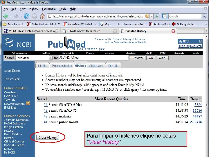 History 11 Pode-se refinar ainda mais a pesquisa combinando a busca #3 (public health and malaria) com o termo “Africa” ou usando o menu opções ("Options")
