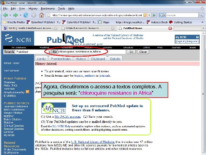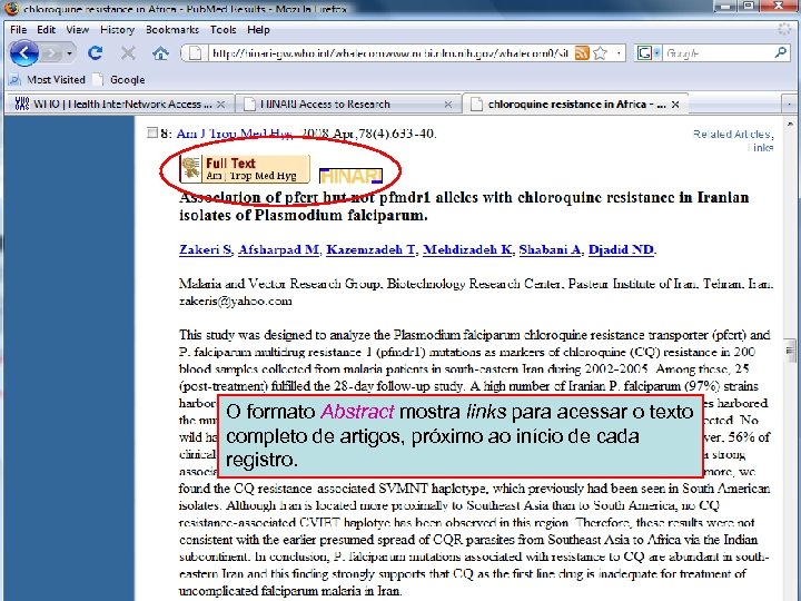 Linking to full text 1 Agora, discutiremos o acesso a textos completos. A pesquisa será: “chloroquine resistance in Africa”