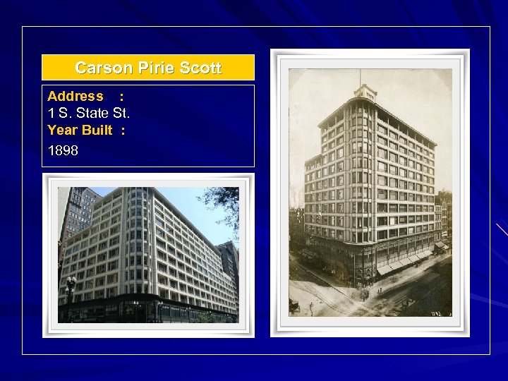 Carson Pirie Scott Address : 1 S. State St. Year Built : 1898
