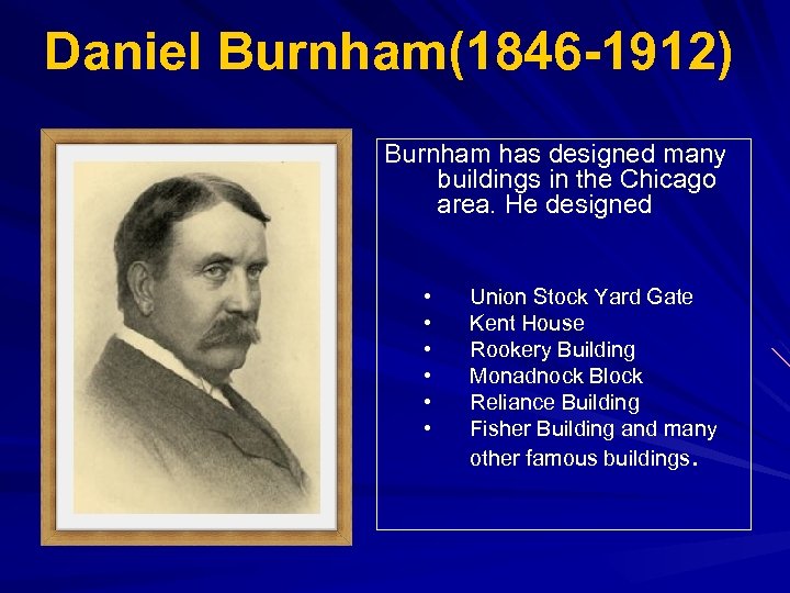 Daniel Burnham(1846 -1912) Burnham has designed many buildings in the Chicago area. He designed • • • Union Stock Yard Gate Kent House Rookery Building Monadnock Block Reliance Building Fisher Building and many other famous buildings.