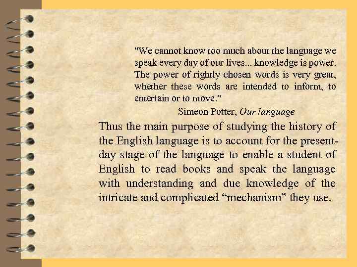 "We cannot know too much about the language we speak every day of our lives. . . knowledge is power. The power of rightly chosen words is very great, whether these words are intended to inform, to entertain or to move. " Simeon Potter, Our language Thus the main purpose of studying the history of the English language is to account for the presentday stage of the language to enable a student of English to read books and speak the language with understanding and due knowledge of the intricate and complicated “mechanism” they use.