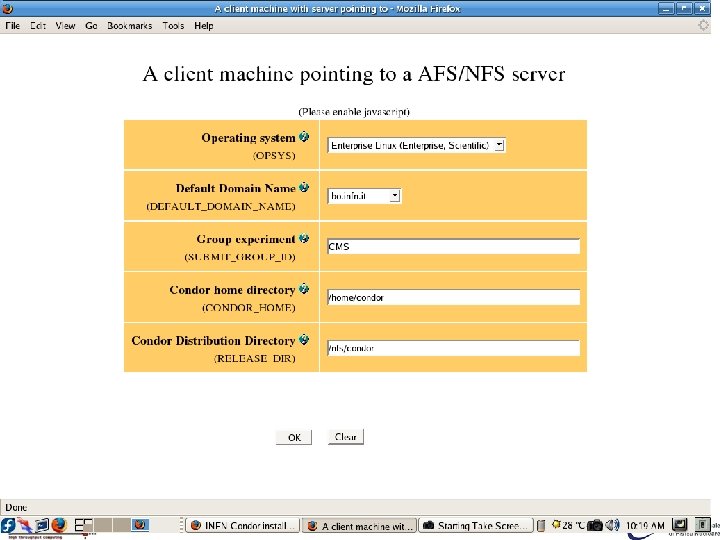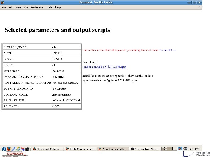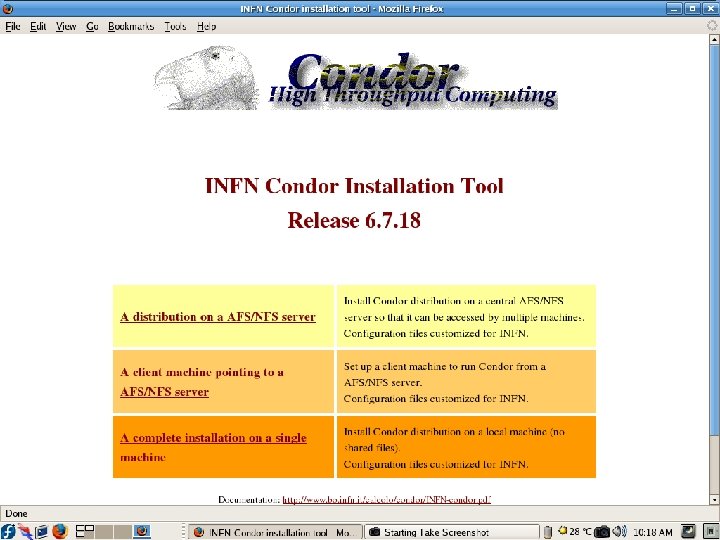 An automatic installation tool • Three type of installation – server: binary and library only – client: configuration files only – Full: client+server • Rpm files are built up • Web interface http: //www. bo. infn. it/calcolo/condor/infn-installation-tool-6. 6. 7. html