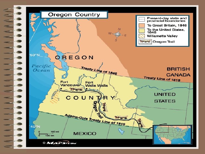 III. Oregon Country A. region west of the Rocky Mountains 1. today consists of: • Oregon • Washington • Idaho • Wyoming • Montana • western Canada B. Disputes over Oregon Country 1. between four countries: • United States • Great Britain (England) • Spain • Russia C. Importance of the Land 1. fur trapping • animals are trapped and their fur is sold for profit