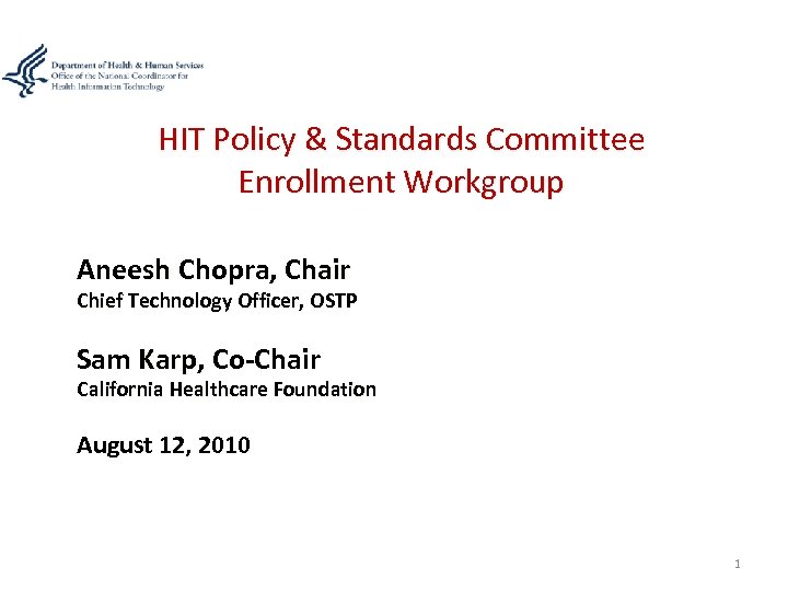 HIT Policy & Standards Committee Enrollment Workgroup Aneesh Chopra, Chair Chief Technology Officer, OSTP Sam Karp, Co-Chair California Healthcare Foundation August 12, 2010 1