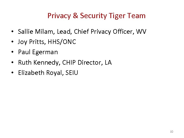 Privacy & Security Tiger Team • • • Sallie Milam, Lead, Chief Privacy Officer, WV Joy Pritts, HHS/ONC Paul Egerman Ruth Kennedy, CHIP Director, LA Elizabeth Royal, SEIU 10