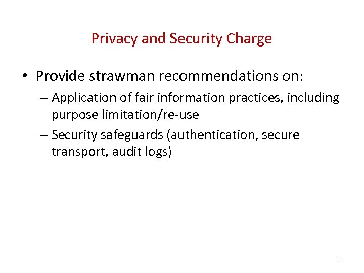 Privacy and Security Charge • Provide strawman recommendations on: – Application of fair information practices, including purpose limitation/re-use – Security safeguards (authentication, secure transport, audit logs) 11