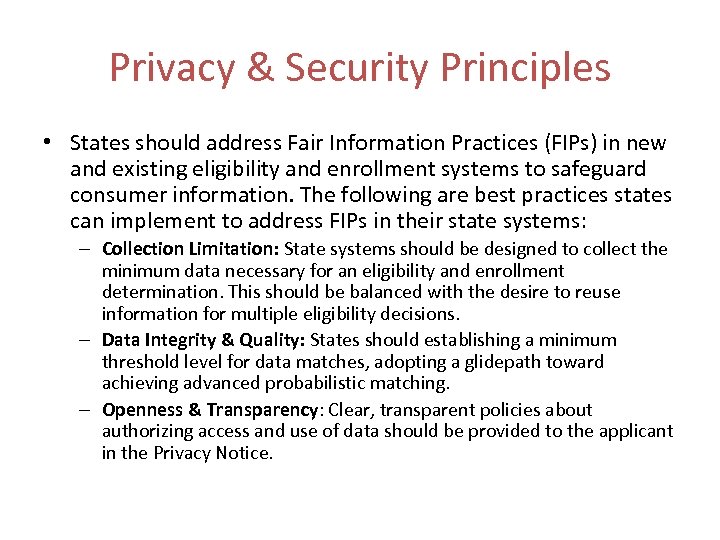 Privacy & Security Principles • States should address Fair Information Practices (FIPs) in new and existing eligibility and enrollment systems to safeguard consumer information. The following are best practices states can implement to address FIPs in their state systems: – Collection Limitation: State systems should be designed to collect the minimum data necessary for an eligibility and enrollment determination. This should be balanced with the desire to reuse information for multiple eligibility decisions. – Data Integrity & Quality: States should establishing a minimum threshold level for data matches, adopting a glidepath toward achieving advanced probabilistic matching. – Openness & Transparency: Clear, transparent policies about authorizing access and use of data should be provided to the applicant in the Privacy Notice.