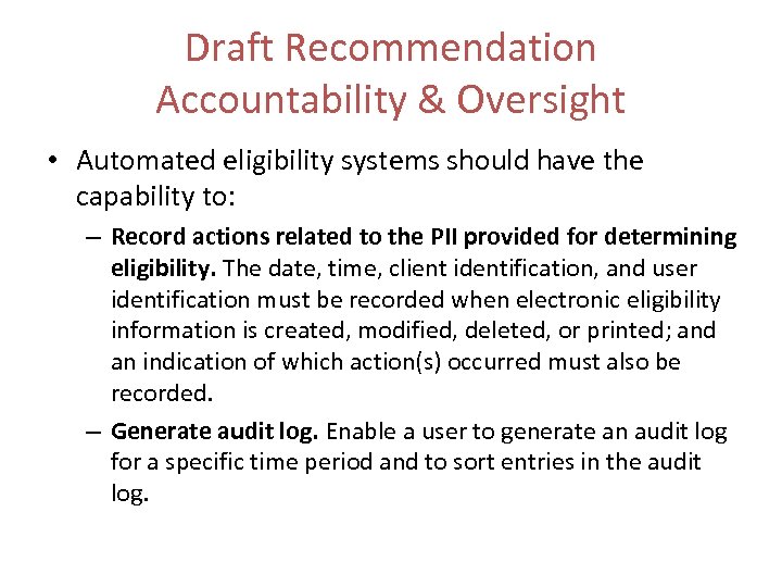 Draft Recommendation Accountability & Oversight • Automated eligibility systems should have the capability to: – Record actions related to the PII provided for determining eligibility. The date, time, client identification, and user identification must be recorded when electronic eligibility information is created, modified, deleted, or printed; and an indication of which action(s) occurred must also be recorded. – Generate audit log. Enable a user to generate an audit log for a specific time period and to sort entries in the audit log.