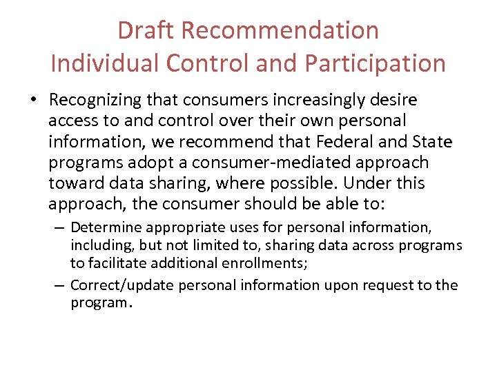 Draft Recommendation Individual Control and Participation • Recognizing that consumers increasingly desire access to and control over their own personal information, we recommend that Federal and State programs adopt a consumer-mediated approach toward data sharing, where possible. Under this approach, the consumer should be able to: – Determine appropriate uses for personal information, including, but not limited to, sharing data across programs to facilitate additional enrollments; – Correct/update personal information upon request to the program.