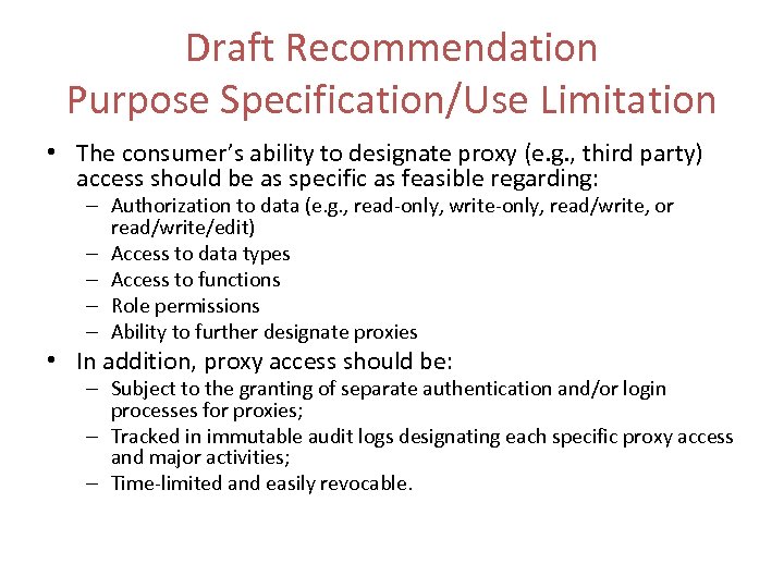 Draft Recommendation Purpose Specification/Use Limitation • The consumer’s ability to designate proxy (e. g. , third party) access should be as specific as feasible regarding: – Authorization to data (e. g. , read-only, write-only, read/write, or read/write/edit) – Access to data types – Access to functions – Role permissions – Ability to further designate proxies • In addition, proxy access should be: – Subject to the granting of separate authentication and/or login processes for proxies; – Tracked in immutable audit logs designating each specific proxy access and major activities; – Time-limited and easily revocable.