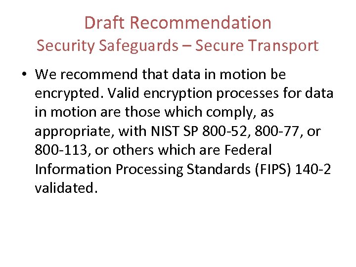 Draft Recommendation Security Safeguards – Secure Transport • We recommend that data in motion be encrypted. Valid encryption processes for data in motion are those which comply, as appropriate, with NIST SP 800 -52, 800 -77, or 800 -113, or others which are Federal Information Processing Standards (FIPS) 140 -2 validated.