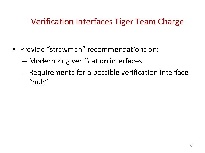 Verification Interfaces Tiger Team Charge • Provide “strawman” recommendations on: – Modernizing verification interfaces – Requirements for a possible verification interface “hub” 22
