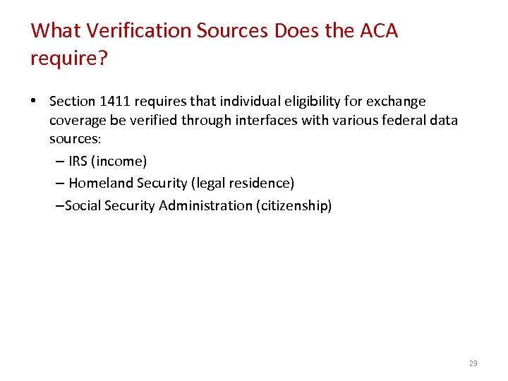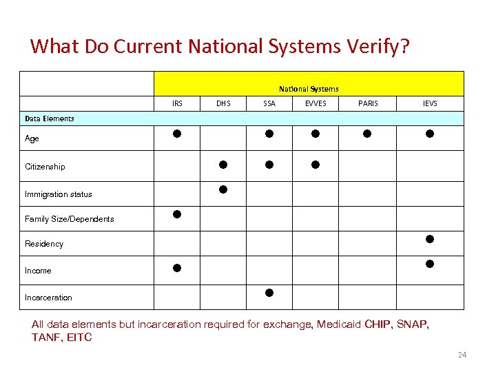What Verification Sources Does the ACA require? • Section 1411 requires that individual eligibility for exchange coverage be verified through interfaces with various federal data sources: – IRS (income) – Homeland Security (legal residence) –Social Security Administration (citizenship) 23