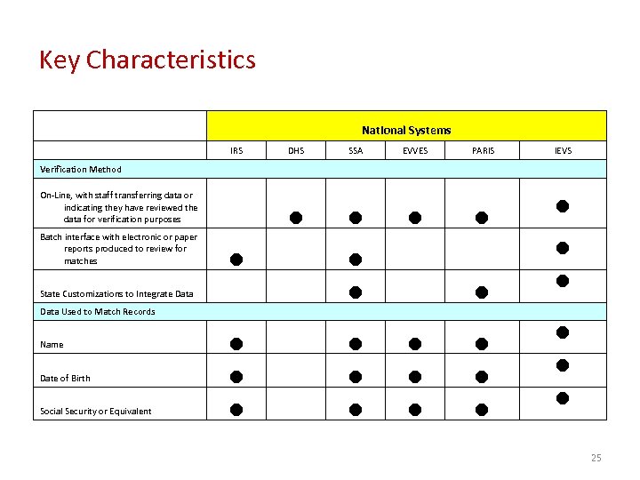 What Do Current National Systems Verify? National Systems IRS DHS SSA EVVES PARIS IEVS n n n Data Elements Age n n Citizenship Immigration status Family Size/Dependents n n n Residency Income Incarceration n All data elements but incarceration required for exchange, Medicaid CHIP, SNAP, TANF, EITC 24