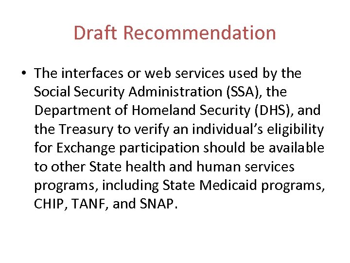 Draft Recommendation • The interfaces or web services used by the Social Security Administration (SSA), the Department of Homeland Security (DHS), and the Treasury to verify an individual’s eligibility for Exchange participation should be available to other State health and human services programs, including State Medicaid programs, CHIP, TANF, and SNAP.